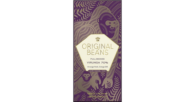 "Original Beans" organic dark chocolate 70% VIRUNGA. This chocolate reveals notes of Morello cherries and black tea from rare 'Amelonado' cacao. Suitable for vegans. Ingredients: cocoa mass*, unrefined cane sugar*, cocoa butter*. * - from organic farms. At least 70% cocoa. May contain traces of almonds, hazelnuts, and milk.