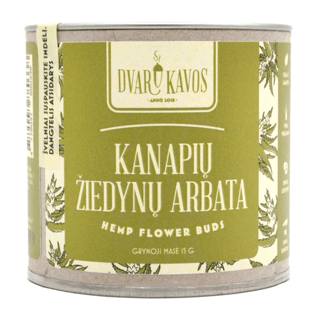 "Dvaro Kavos" hemp flower tea - tea made from hemp flowers grown in Lithuania, carefully hand-picked and qualitatively dried. It has a yellowish-green color, and the taste is quite specific; however, to soften it and enhance its nutritional properties, we recommend adding milk (E471), cream (E471), butter (E471), or plant-based drinks. Perfect for starting your day or in the evening, before sleep. Caffeine-free. Hemp flower tea does not have intoxicating effects and is suitable for consumption at any age.