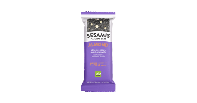 Organic 'Almond Noir' bar with black sesame and honey, enriched with almonds