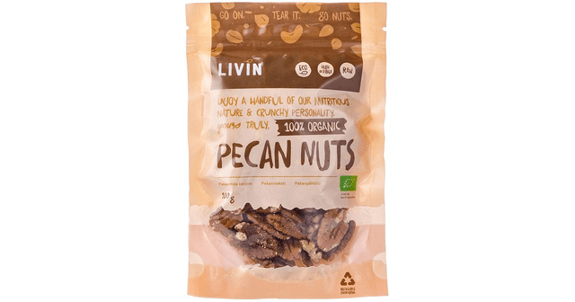 LIVIN organic pecan nuts - a delicious, very filling, nutritious and healthy snack that is always good to have with you. It is tasty to eat as a snack, to add to salads, desserts, dry breakfasts, baked goods, and other dishes. It has a lot of fiber. Suitable for vegans and raw foodists. It looks like a walnut, but the flavor of pecan nuts is much milder and sweeter. In recyclable packaging. The resealable package strips allow the package to be reopened and closed, helping to preserve the product's flavor properties. Store in a dry, cool place away from sunlight. Not suitable for children under 3 years; choking hazard. Certified organic product. LT-EKO-001, non-EU agriculture. Ingredients: organic pecan nuts.