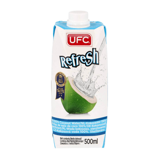 UFC REFRESH Coconut Water - a refreshing and natural 100% coconut water from Thailand, perfect for restoring fluid balance after physical activity. No added sugars or preservatives, rich in magnesium, and free from fat and cholesterol.