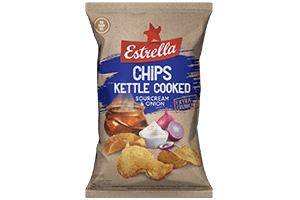 Pasimėgaukite skaniais ESTRELLA KETTLE bulvių traškučiais su grietinės ir svogūnų skoniu. Lietuviška kokybė, tobula kaip užkandis bet kuriai progai. 120 g skanėsto, kuris užkariaus jūsų skonio receptorius!