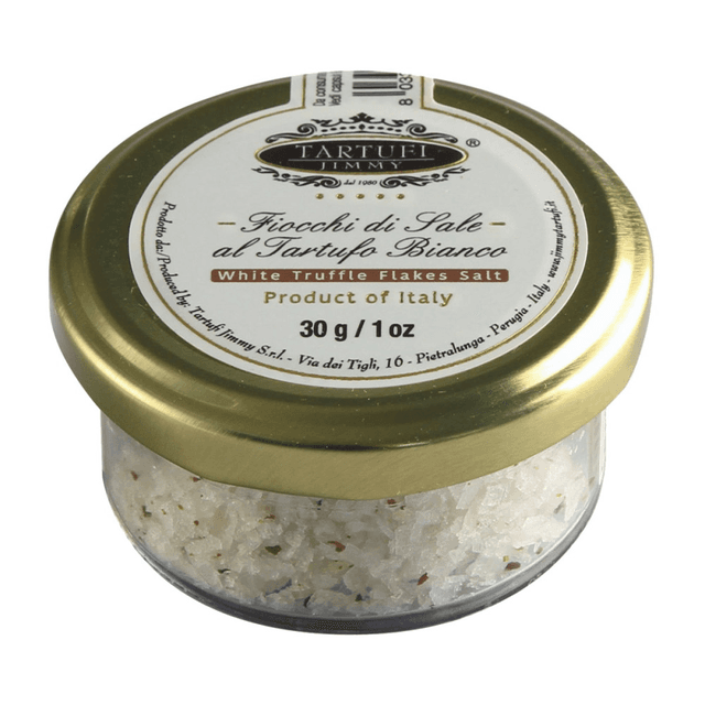 „Tartufi Jimmy“ druskos dribsniai (E535) su baltaisiais trumais (Tuber magnatum Pico) puikiai pagardins įvairius patiekalus nuo kiaušinienių, troškintų daržovių iki keptos mėsos. Svarbu nepamiršti, kad, norint malonaus druskos dribsnių traškumo, geriausia juos užbarstyti jau paėmę patiekalą nuo ugnies. Druskos dribsniai yra mechaniškai suslėgta druska – plokšti druskos gabalėliai. Baltieji trumai (Tuber magnatum Pico) yra laikomi vienais vertingiausių trumų visame pasaulyje (E621) dėl savo puikių organoleptinių savybių. Baltieji trumai yra kiek švelnesnio kvapo ir skonio nei juodieji. Maloniai kvepia ąžuolais, muskusu ir alyvuogėmis. Jie turi pikantišką skonį, vos jaučiamą aitrumą, žemiškų ir riešutų natų. Lengvai atpažįstami dėl savo auksinės, ochros spalvos. Viduje geltoni arba rusvi, su baltais „venomis“. Derlius renkamas spalio–gruodžio mėnesiais. Dažniausiai randami po ąžuolais, beržais, tuopomis ir kitais medžiais. Trumai, dar vadinami „požemių perlais“, „virtuvės brangakmeniais“ ir „elfų obuoliais“, yra nuostabus delikatesas, kurio kilogramas gali kainuoti ne vieną šimtą eurų. Organoleptinės trumų savybės. Nelengva apibūdinti trumų aromatą ir skonį tiems, kurie jų nėra ragavę. Svarbu paminėti, kad jie yra išties intensyvaus ir išskirtinio skonio bei kvapo. Specialistai jį apibūdina kaip panašų į garstyčių ir ilgai brandinto sūrio. Kai kurie teigia, kad kvapas primena česnakus, konservuotus kukurūzus, muskusą ir riešutus. Kartą pauostę trumų, lengvai įsiminsite šį kvapą ir jį atpažinsite. Jie gali būti įvairaus dydžio: nuo mažų kamuoliukų kelių centimetrų skersmens iki bulvės dydžio, sveria 10–60 g. Šių grybų paviršius kiek grublėtas, o po juo esantis mėsingas minkštimas gali būti tiek tamsios, tiek kreminės spalvos. Trumų forma šiek tiek priklauso nuo dirvožemio: jei žemė minkšta, jie auga apvalūs ir glotnūs, jei kieta – netaisyklingos formos, nes kovoja dėl erdvės. Trumai auga po žeme, todėl jų ieškant į pagalbą pasitelkiamos kiaulės arba šunys, kurių ypatinga uoslė leidžia surasti šiuos grybus. Kvapas yra pagrindinis trumų brandos ir kokybės požymis, nes jų aromatas atsiranda tik tada, kai grybai yra tinkamai subrendę. Šviežius trumus prieš vartojant reikia nuplauti vandeniu ir nešvarumus nuvalyti šepetėliu. Grybo išorė turi būti visiškai švari – tik tada galima lupti žievelę ir smulkinti su specialiomis pjaustyklėmis. Nerekomenduojama vartoti trumų su ryškaus skonio ir aromato maistu. Šie grybai labiausiai tinka gardinti švelnaus skonio produktus: ryžius, makaronus, bulves ir pan. Taip pat išryškinti visus trumų skonio atspalvius padeda riebumas, tad sūriai, sviestas ir aliejus puikiai su jais dera.