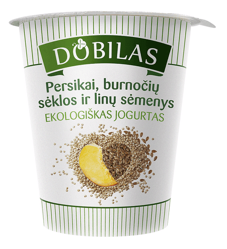 Ekologiškas jogurtas DOBILAS su persikais, burnočio sėklomis ir linų sėmenimis 3,2% rieb. 300g