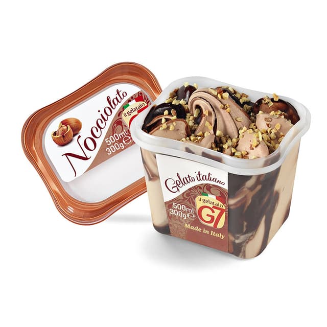 Itališki ledai be glitimo G7 Nocciolato, lazdyno riešutų ir kakavos skonio su riešutiniu sirupu, 500
