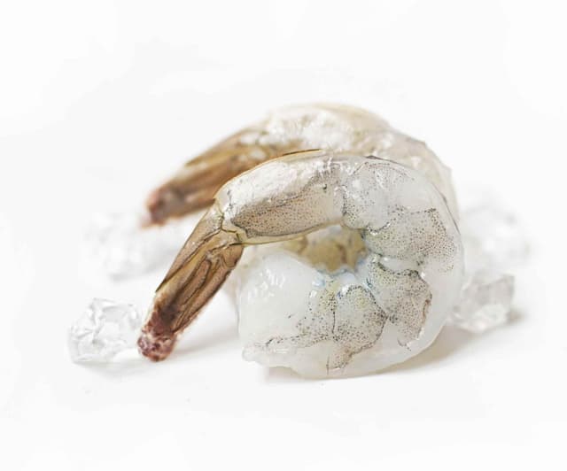 Šaldytos baltakojės blyškiosios krevetės, nevirtos, lukštentos, su uodegomis, 26/30, 20 % glazūra,1k