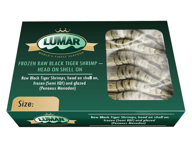 Šaldytos didžiosios tigrinės krevetės, nevirtos, su galvomis, su kiautais, 13/15, 20% glazūros, 800g