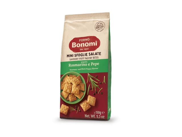 Sluoksniuotos tešlos užkandžiai FORNO BONOMI, su rozmarinu ir pipirais, 150 g
