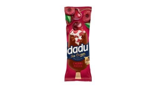 Šokoladu glaistyti vanilės skonio ledai DADU, su vyšnių gabaliukais ir vyšn. įd .100 ml / 63 g