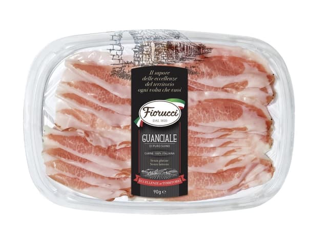 Sūdytos kiaulių pažandės FIORUCCI, Guanciale, su prieskoniais, griežinėliais, nerūšinė, 90g