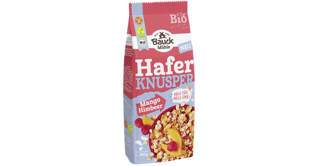 Traškūs avižų sausi pusryčiai su mangais ir avietėmis, ekologiški