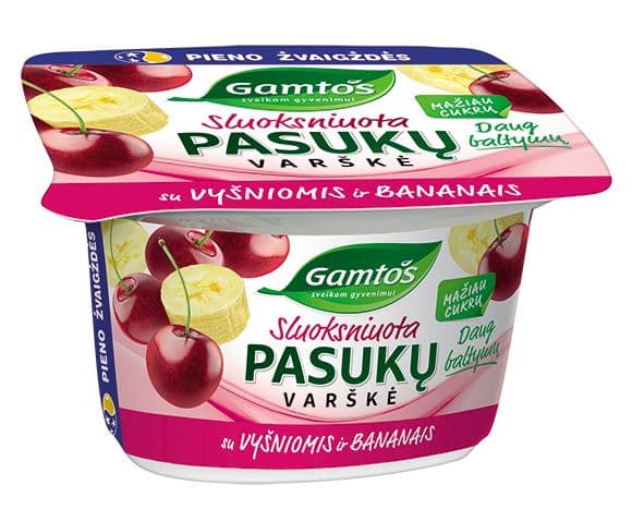 Varškė GAMTOS, 2%, pasukų, be laktozės, su vyšniomis ir bananais, 130 g