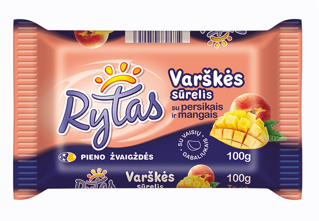 Varškės sūrelis RYTAS, su persikais ir mangais, 7%,100 g